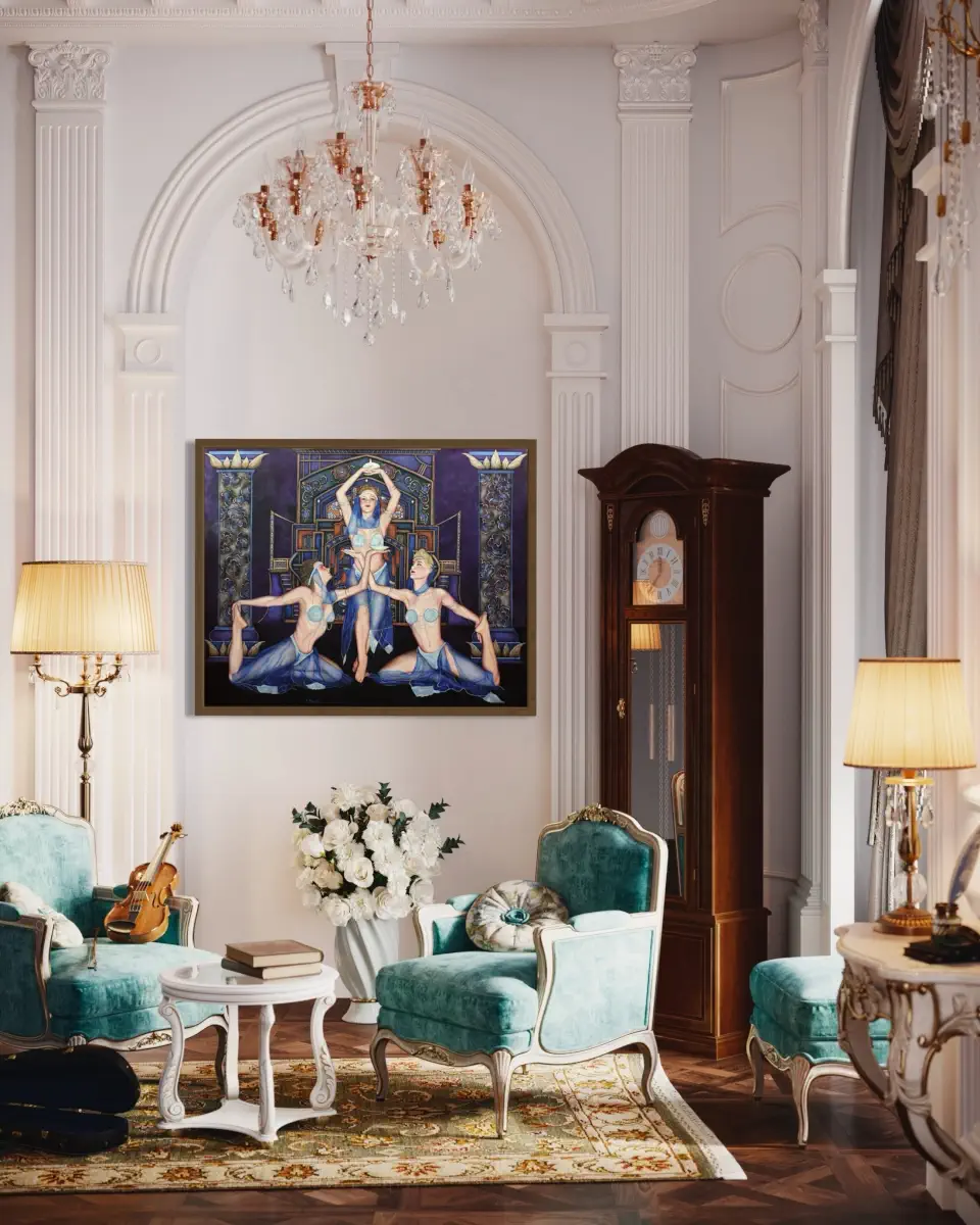This painting presents an exquisite display of elegance, harmony, and theatrical storytelling. The composition evokes the spirit of a mythical ritual or a staged performance.