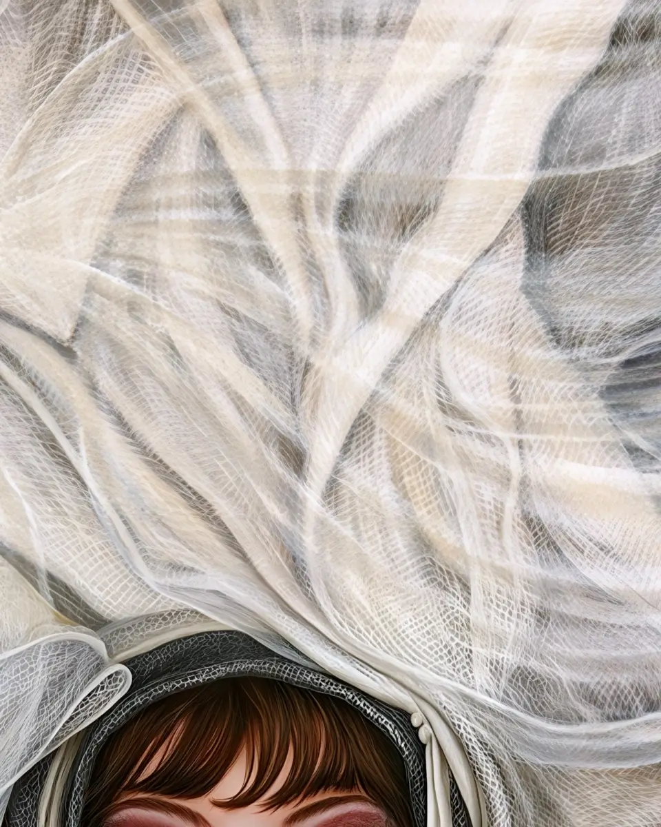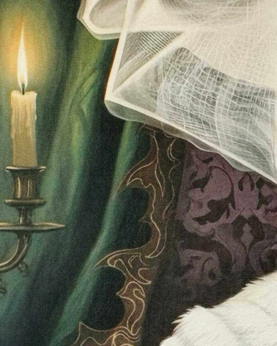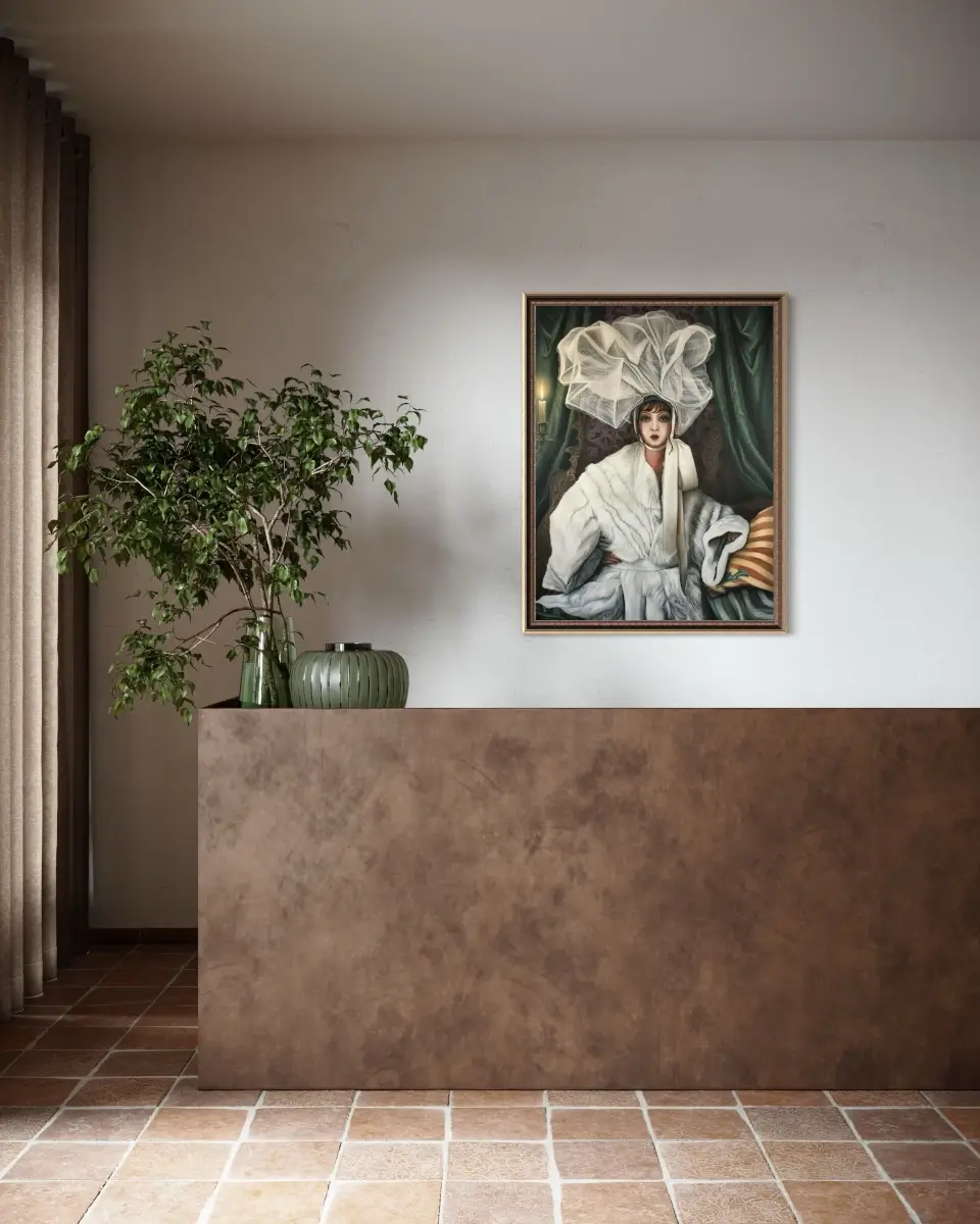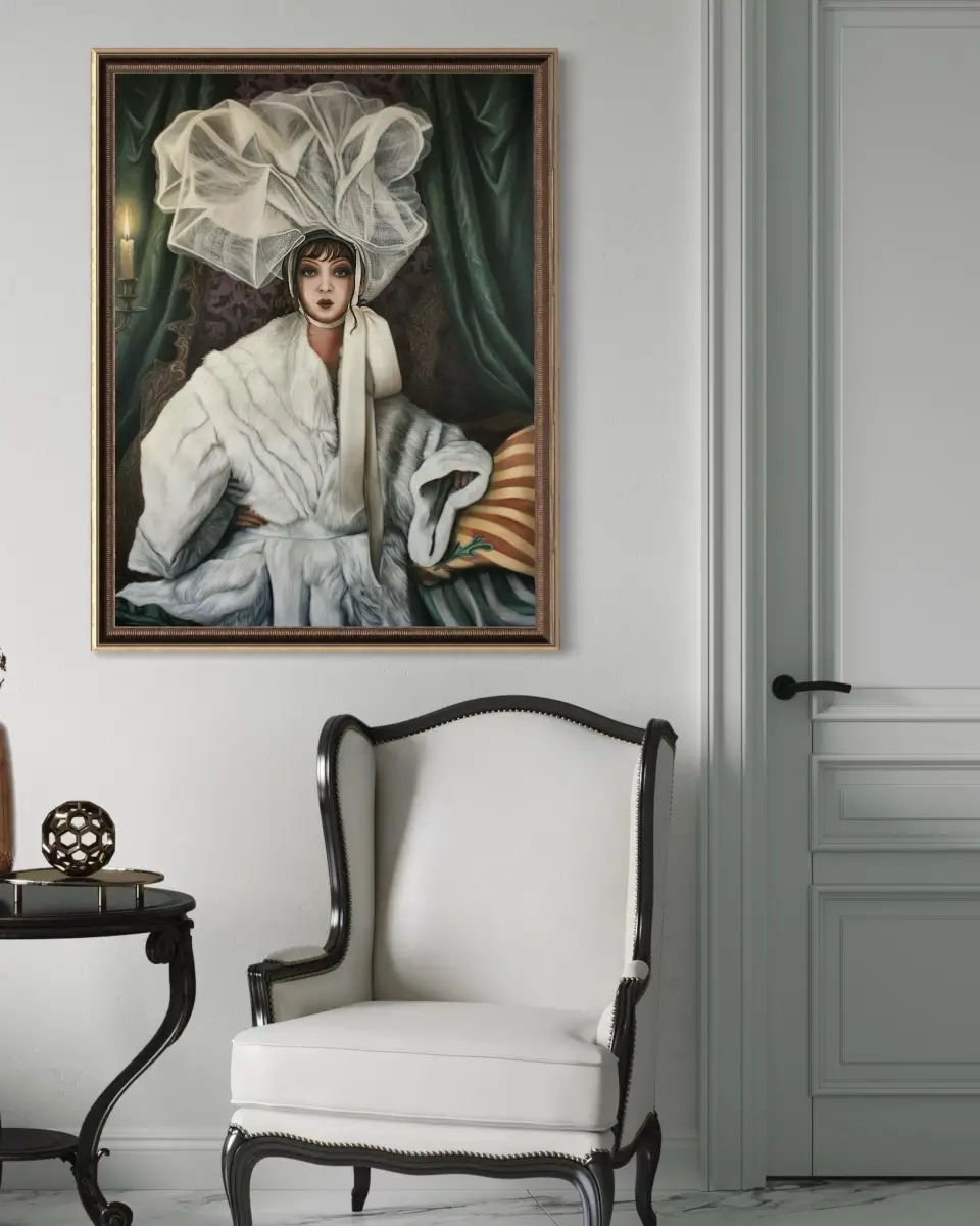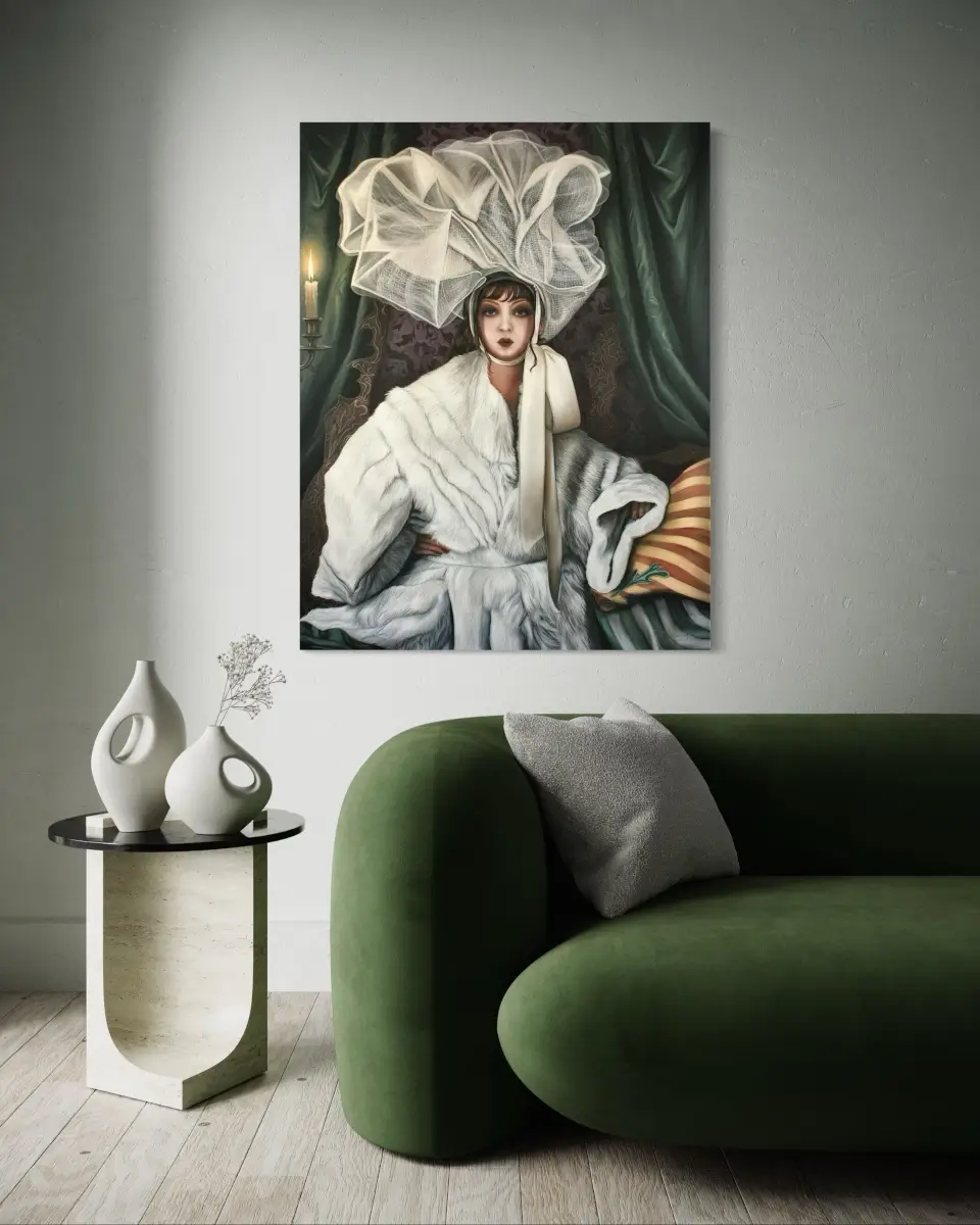 Wrapped in opulent textures, a poised woman gazes outward with quiet defiance and allure. Her extravagant headpiece, evokes both fragility and grandeur, while the rich interplay of fabrics explores themes of beauty, luxury, and self-possession. The composition emerges as an exploration of grace and haute style.