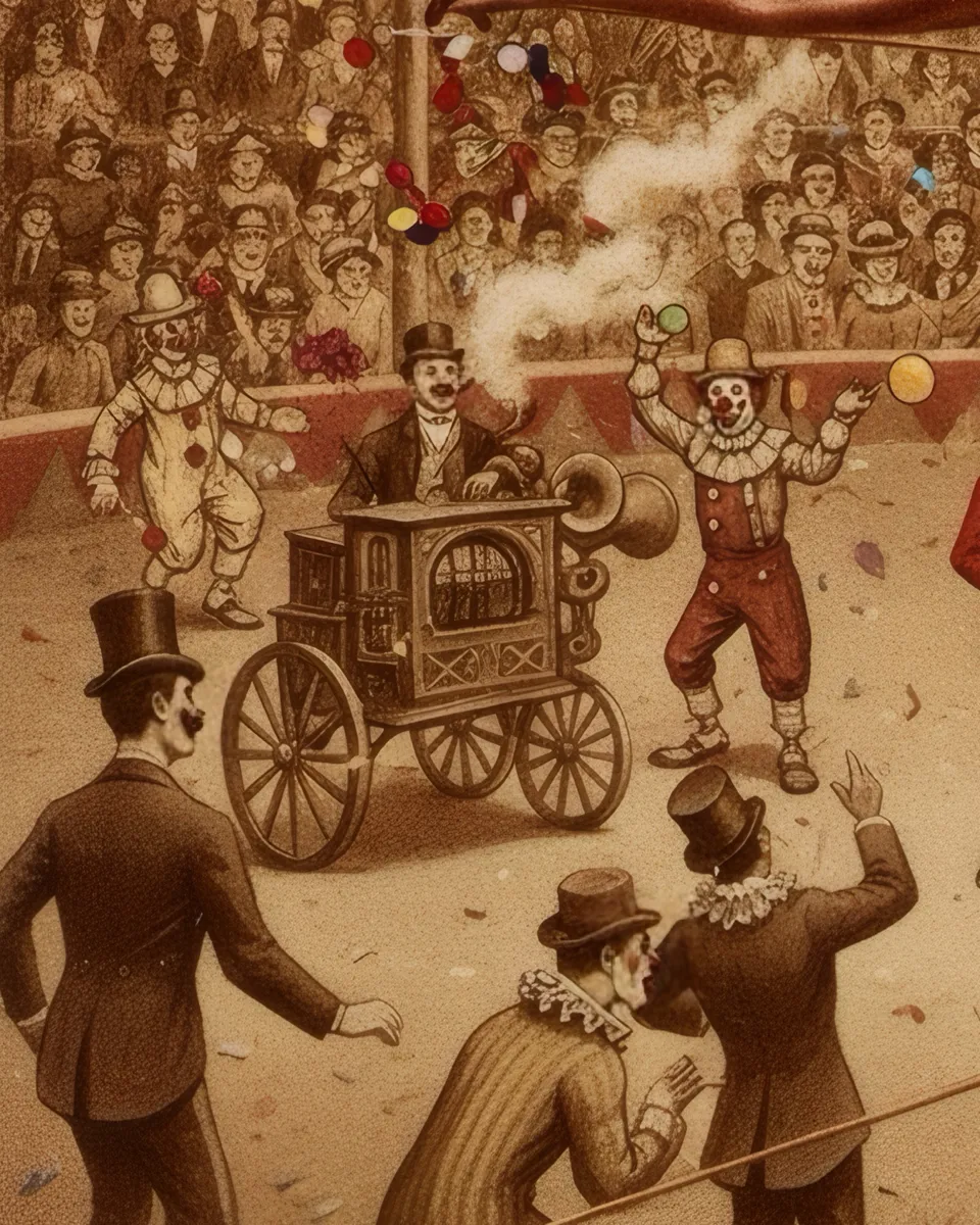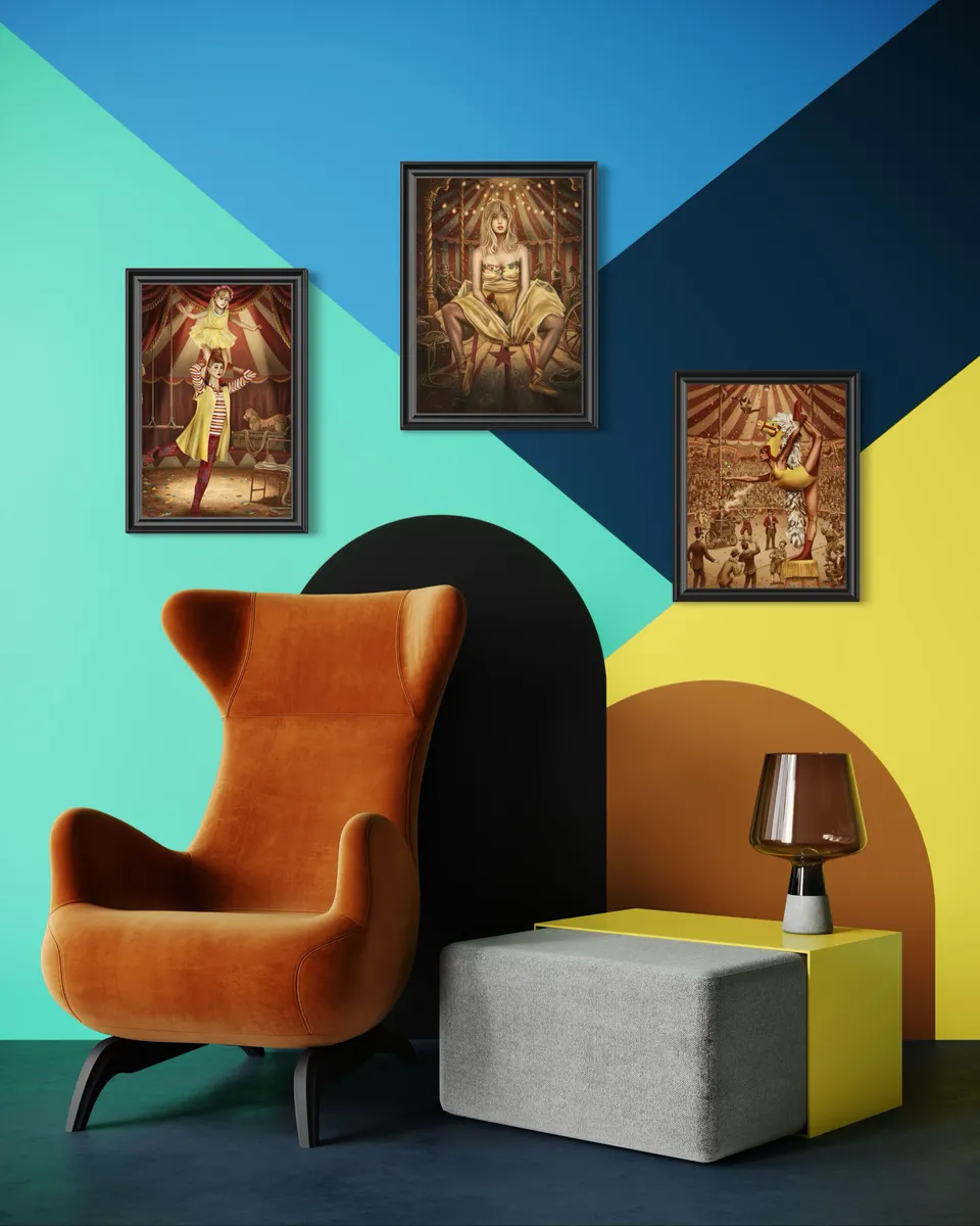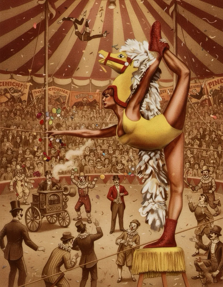 This spectacle in the ring is an energetic homage to the golden age of the circus. The artwork bursts with movement and vitality, presenting a captivating central figure —an aerialist- set against a crowded, vintage big top. From the dusty floor to the worn velvet tents, every element underscores the vibrant, high-risk world of the traveling circus. The piece captures the true essence of grandeur - not merely in technical skill, but in the scale, spirit, and drama of the moment.