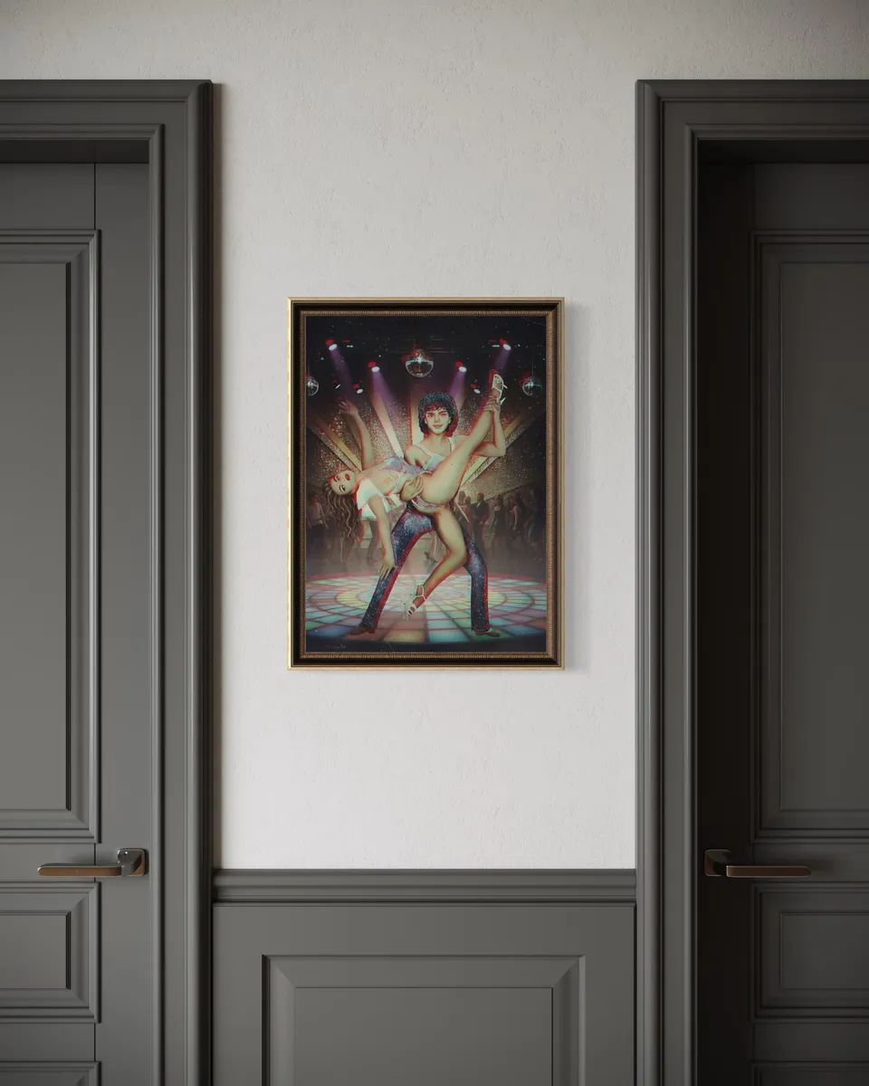 This painting pays homage to the cultural zenith of the late 1970s, encapsulating the reckless glamour and ecstatic energy of the disco era.