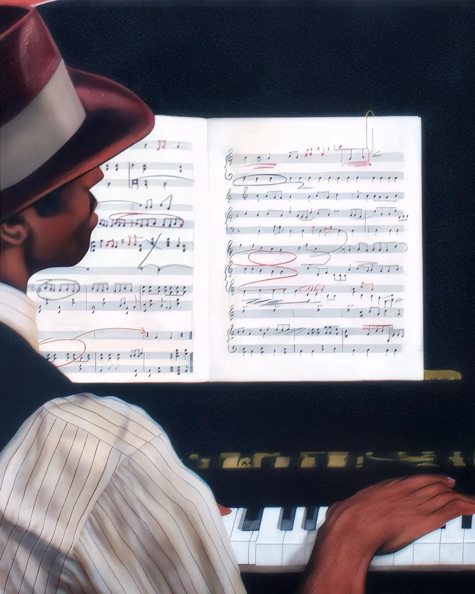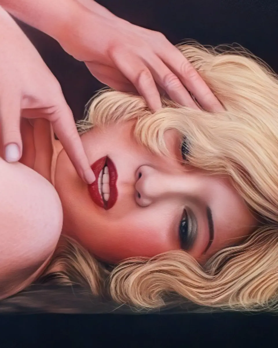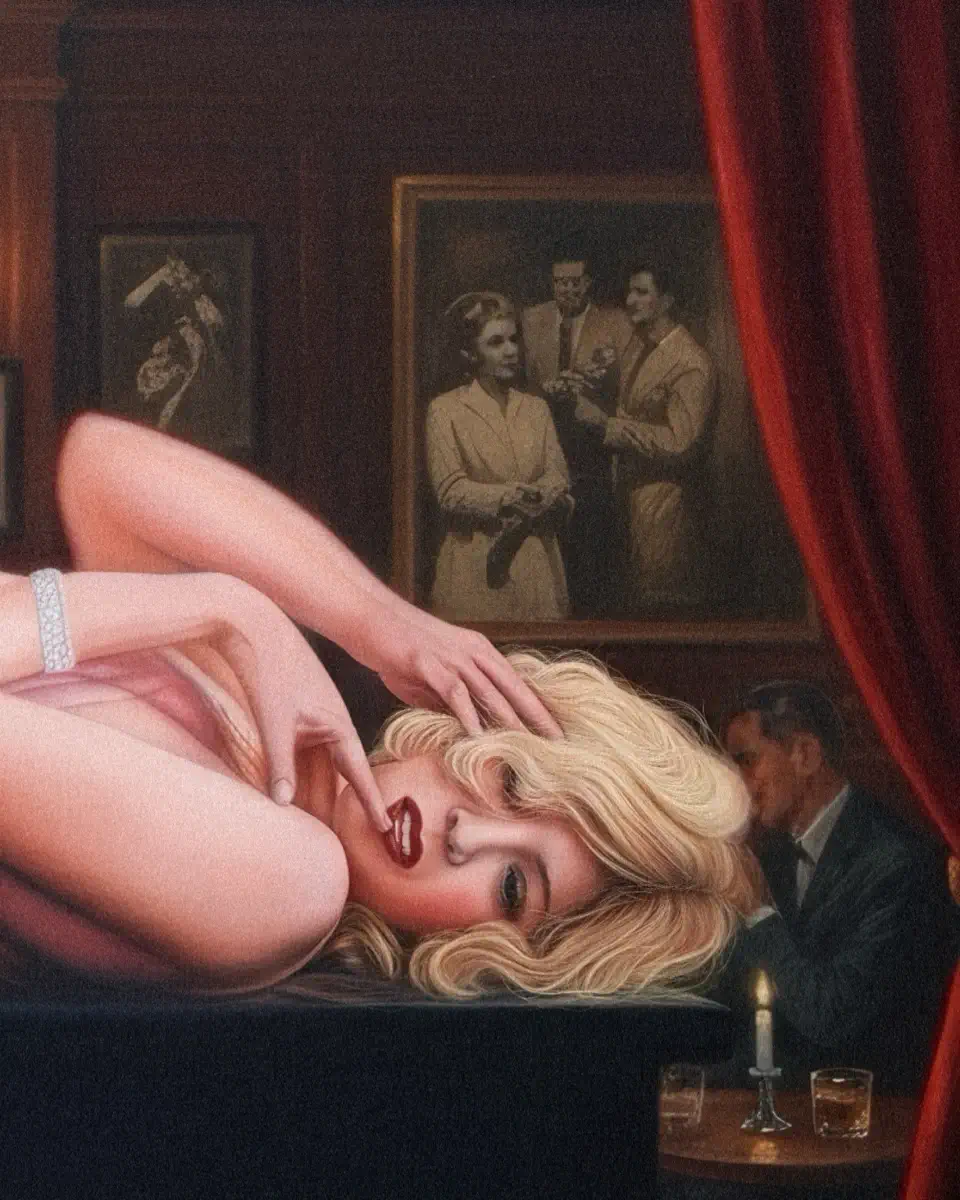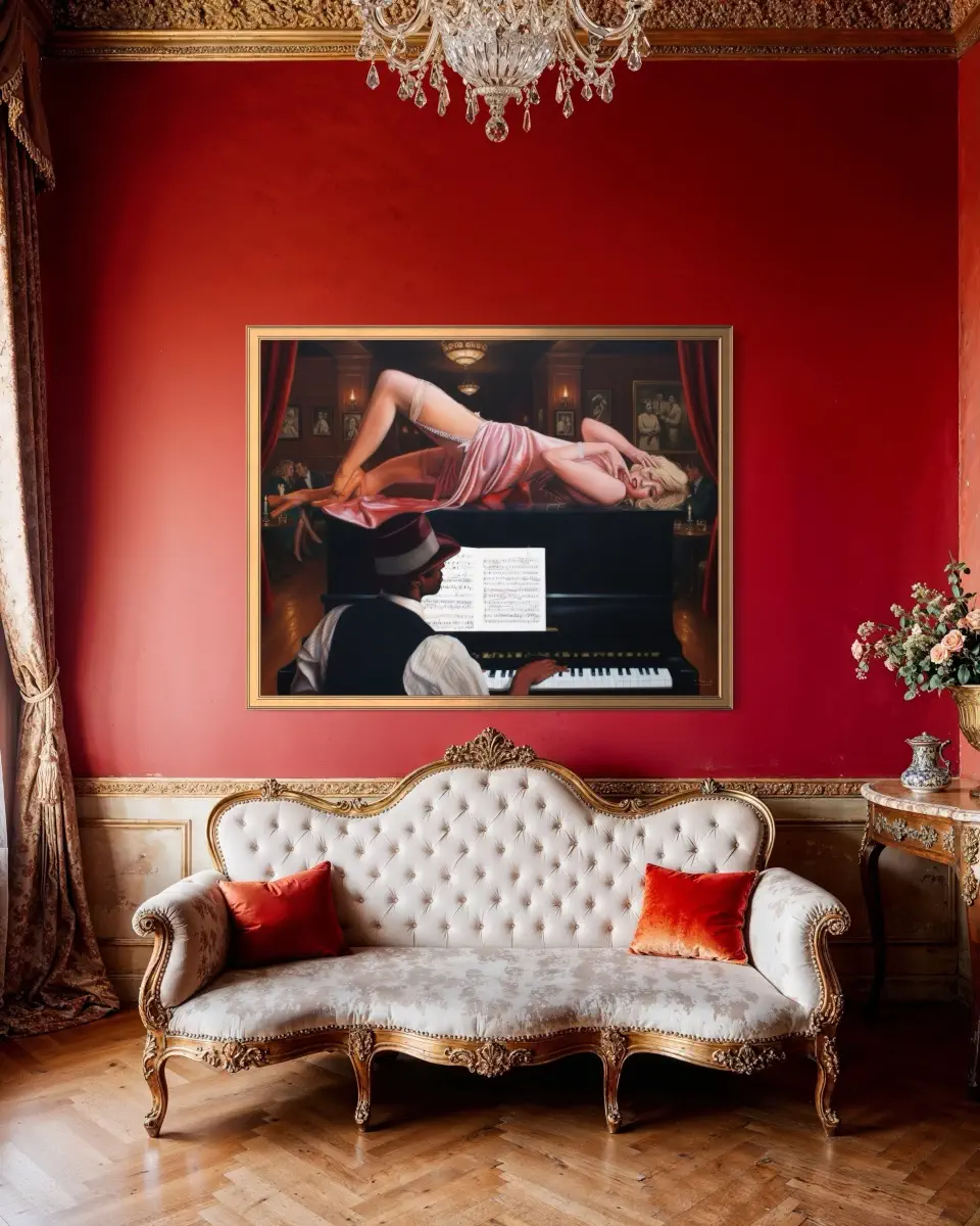 A cinematic scene of passion, suspended between seduction and reverie. This painting unfolds a silent dialogue between desire and music - a timeless vision where sound and sensuality intertwine. It evokes the delicate tension between spectacle and intimacy, capturing the secret poetry of performance.