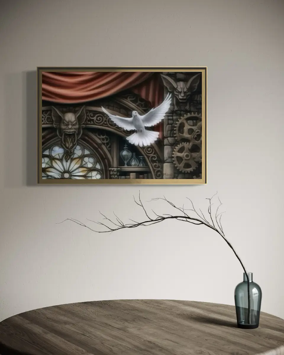 The painting evokes a powerful image of light overcoming darkness, spirit defying gravity, and purity emerging from turmoil. Suggesting resurrection, liberation, or renewal, the work symbolizes peace, innocence, and divine presence.
