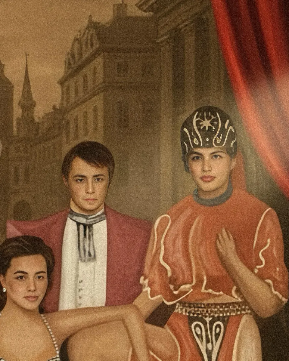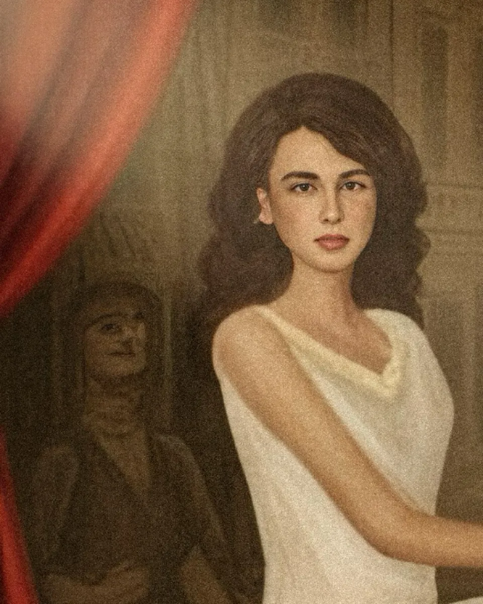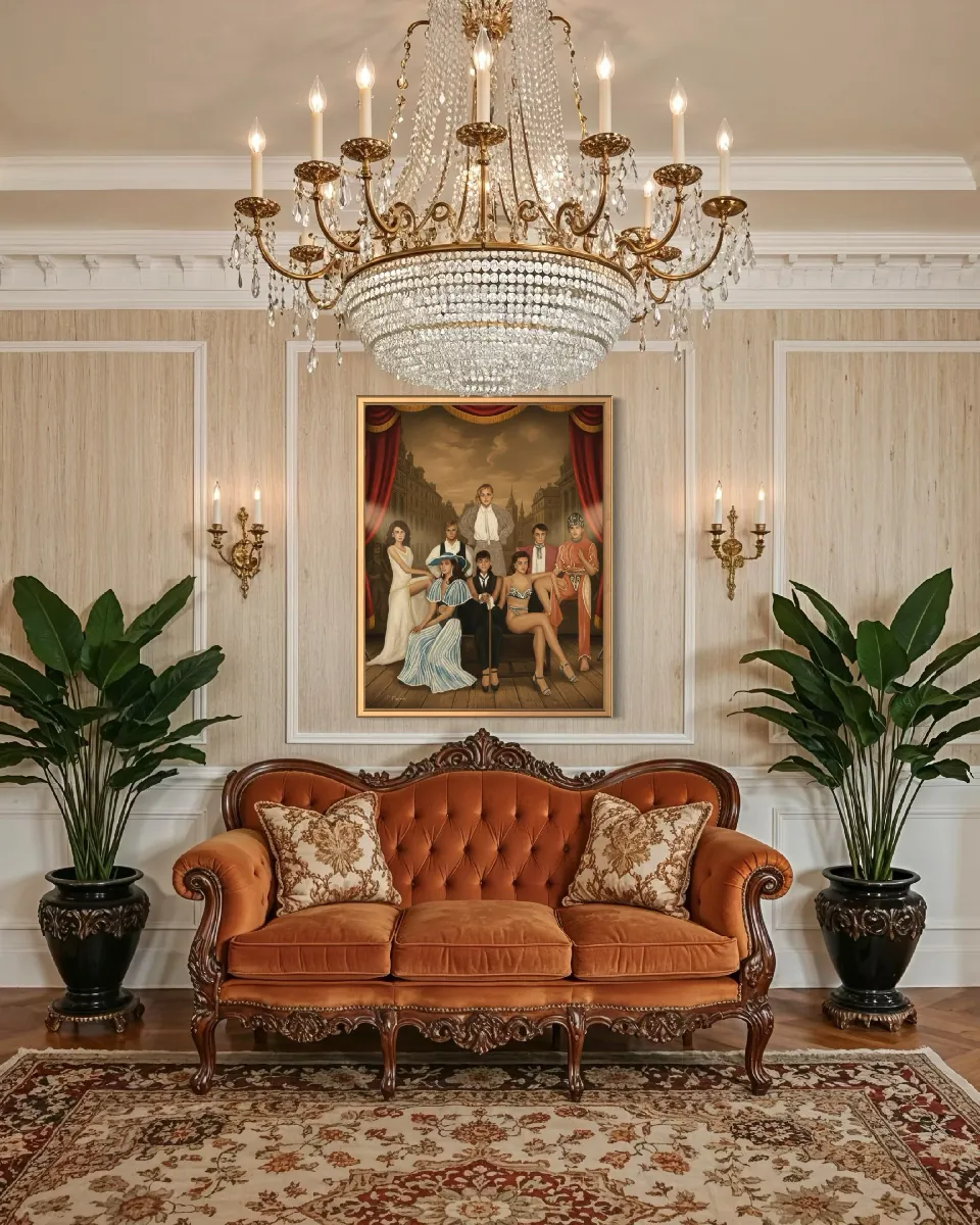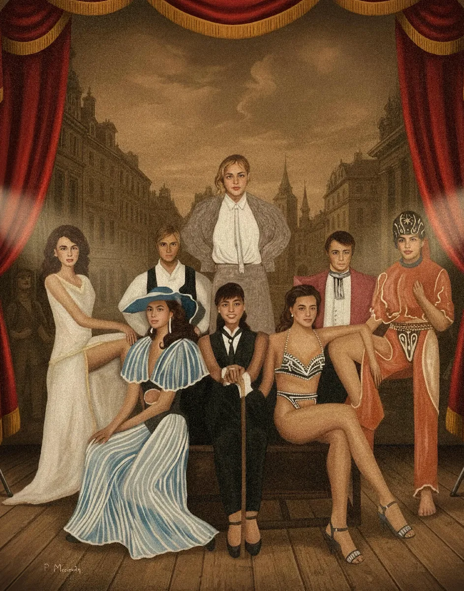 This painting captures a timeless theatrical moment, where elegance, mystery, and character converge beneath rich velvet curtains. Each figure, adorned in distinct vintage attire, embodies a role in a silent performance. Bathed in a warm, nostalgic glow, the scene feels both intimate and grand — a tribute to the enchantment of the stage and the dreams it brings to life.