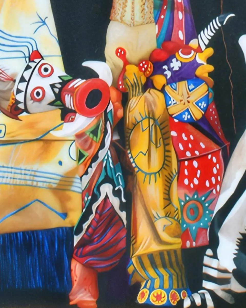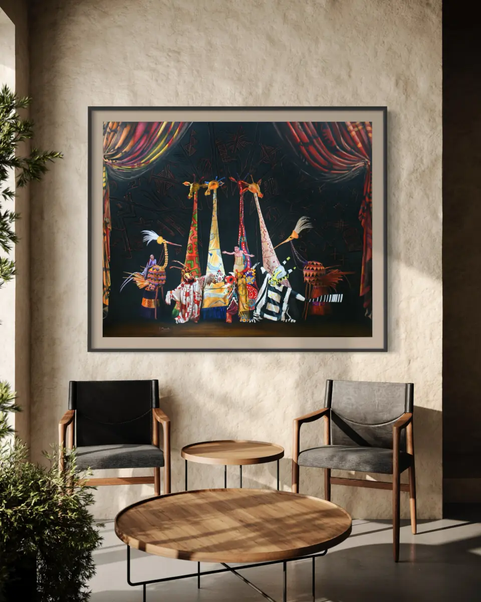 The textured, tribal-inspired backdrop enhances the depth and drama, creating a joyful and immersive spectacle.