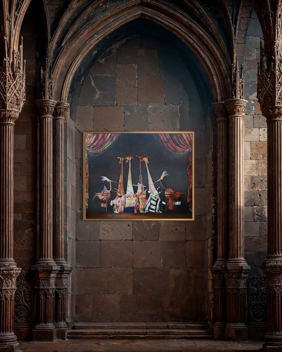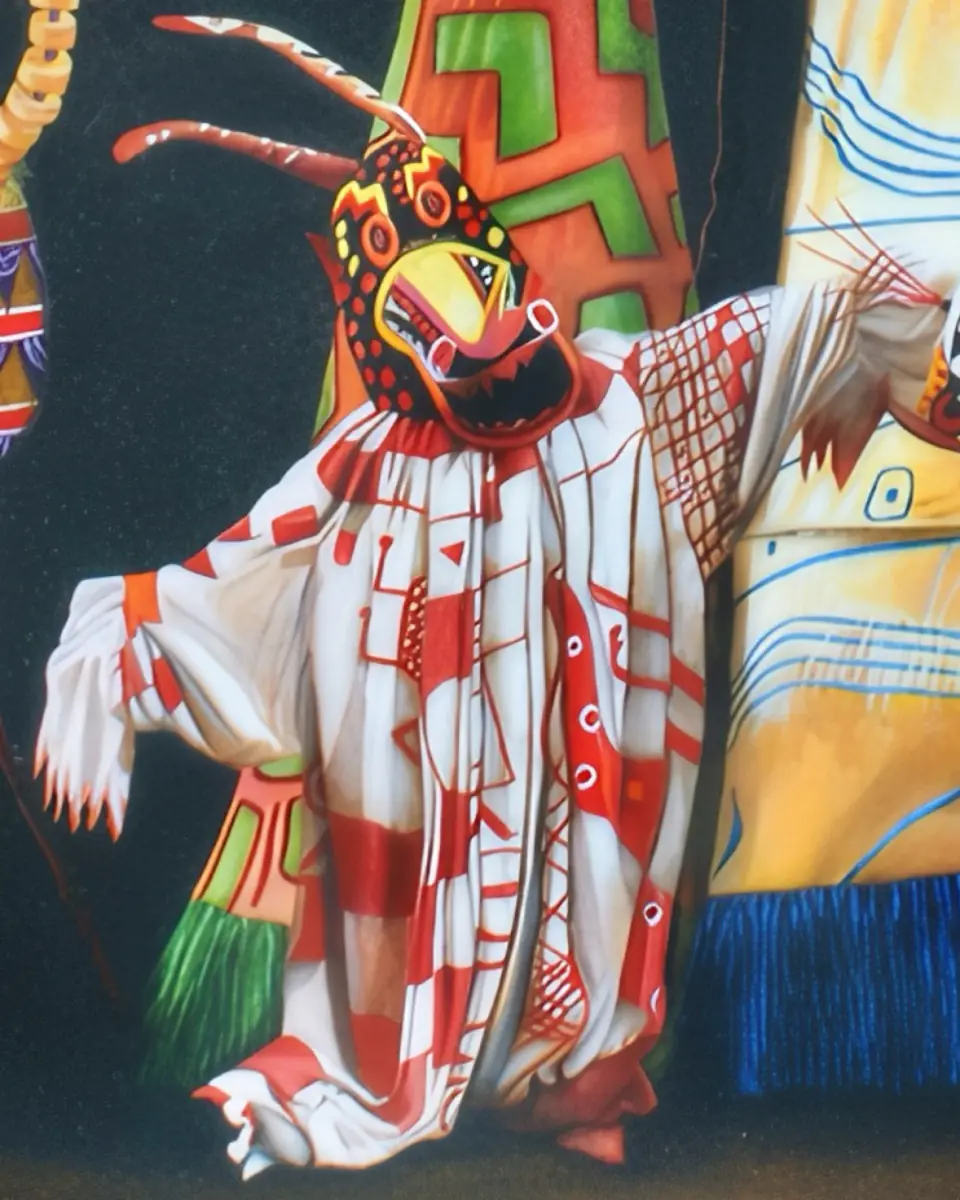 This painting is a visually striking and highly artistic dramatic scene, featuring mysterious, elaborately exaggerated costumes that suggest a deep, ceremonial cultural event.