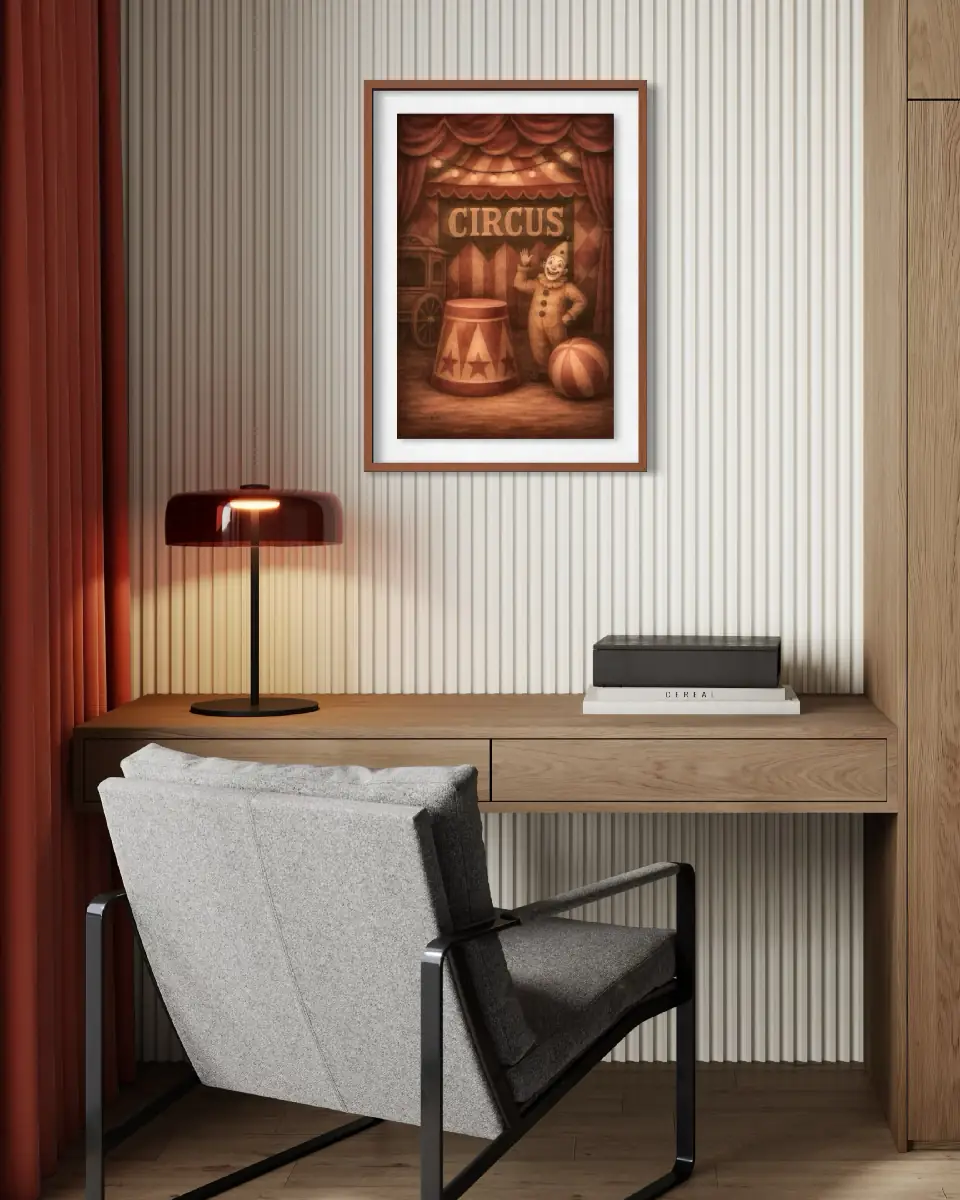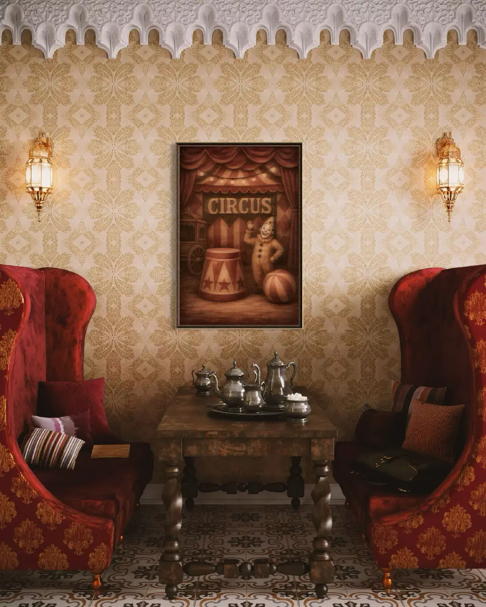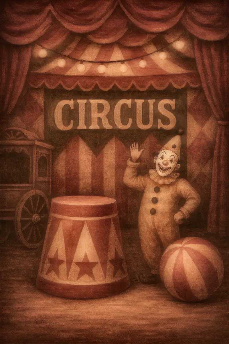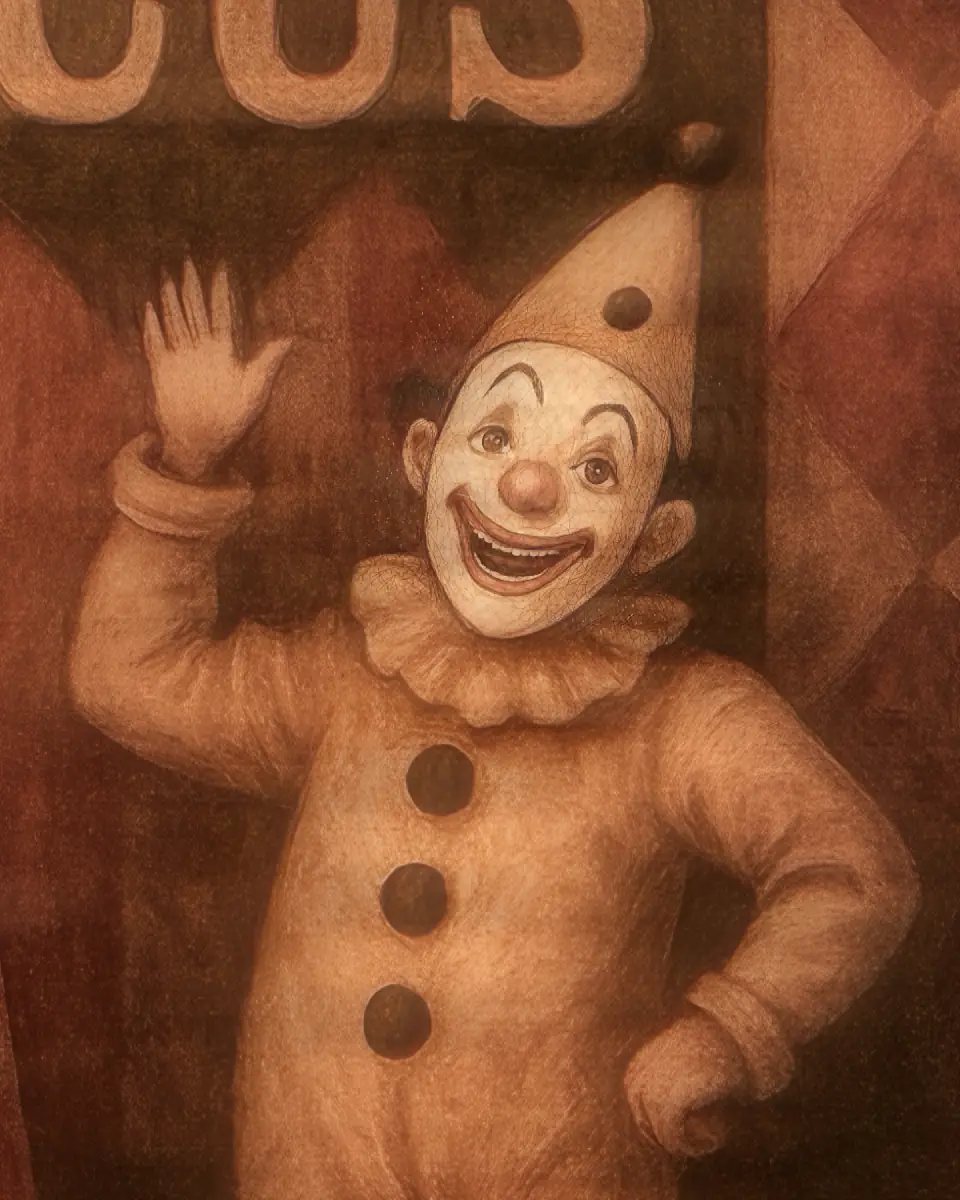 This artwork captures the poignant stillness of a performer left behind by time. Beneath the muted glow of circus lights, the figure stands suspended between laughter and silence — a relic of joy whose echo lingers long after the applause has faded.
