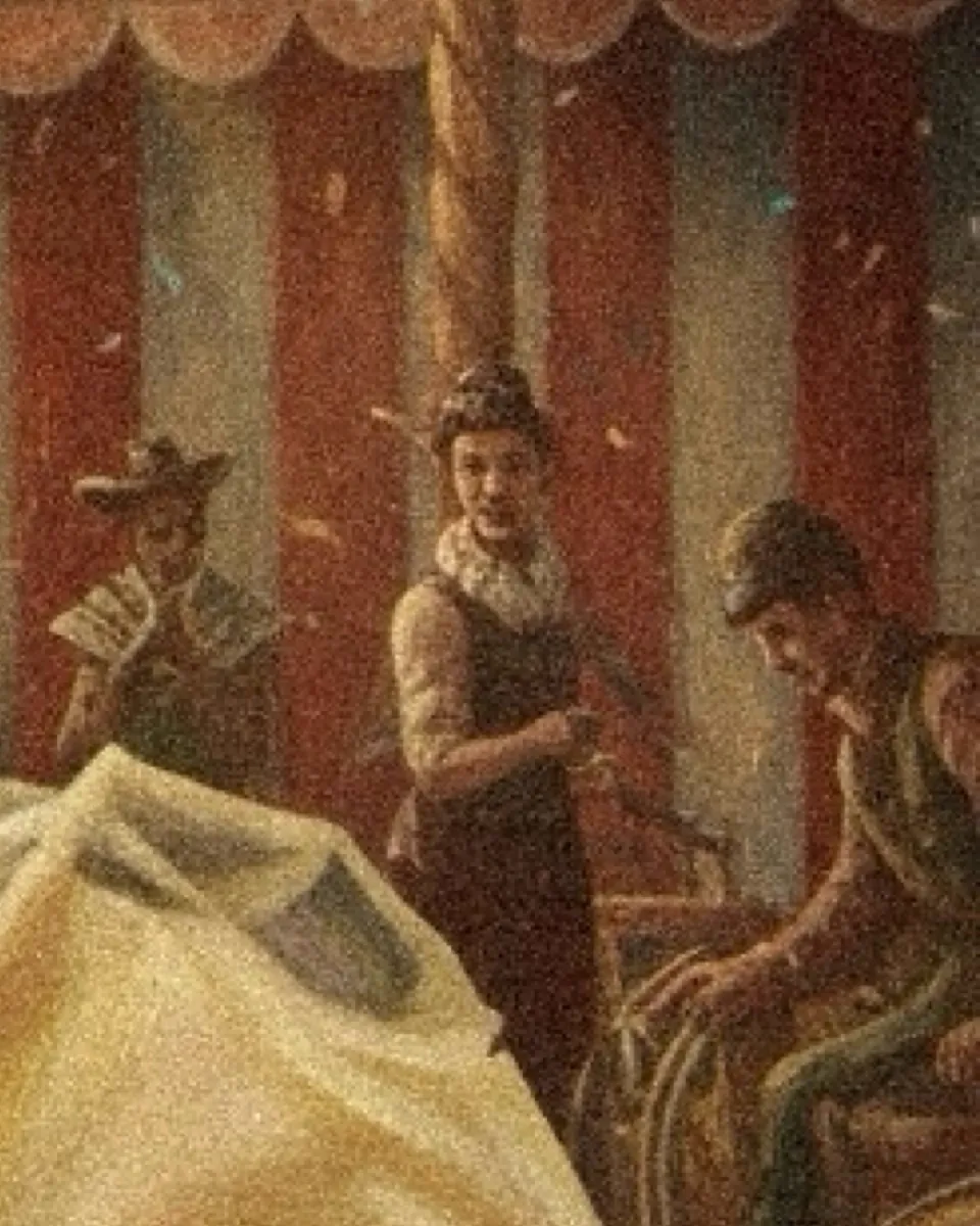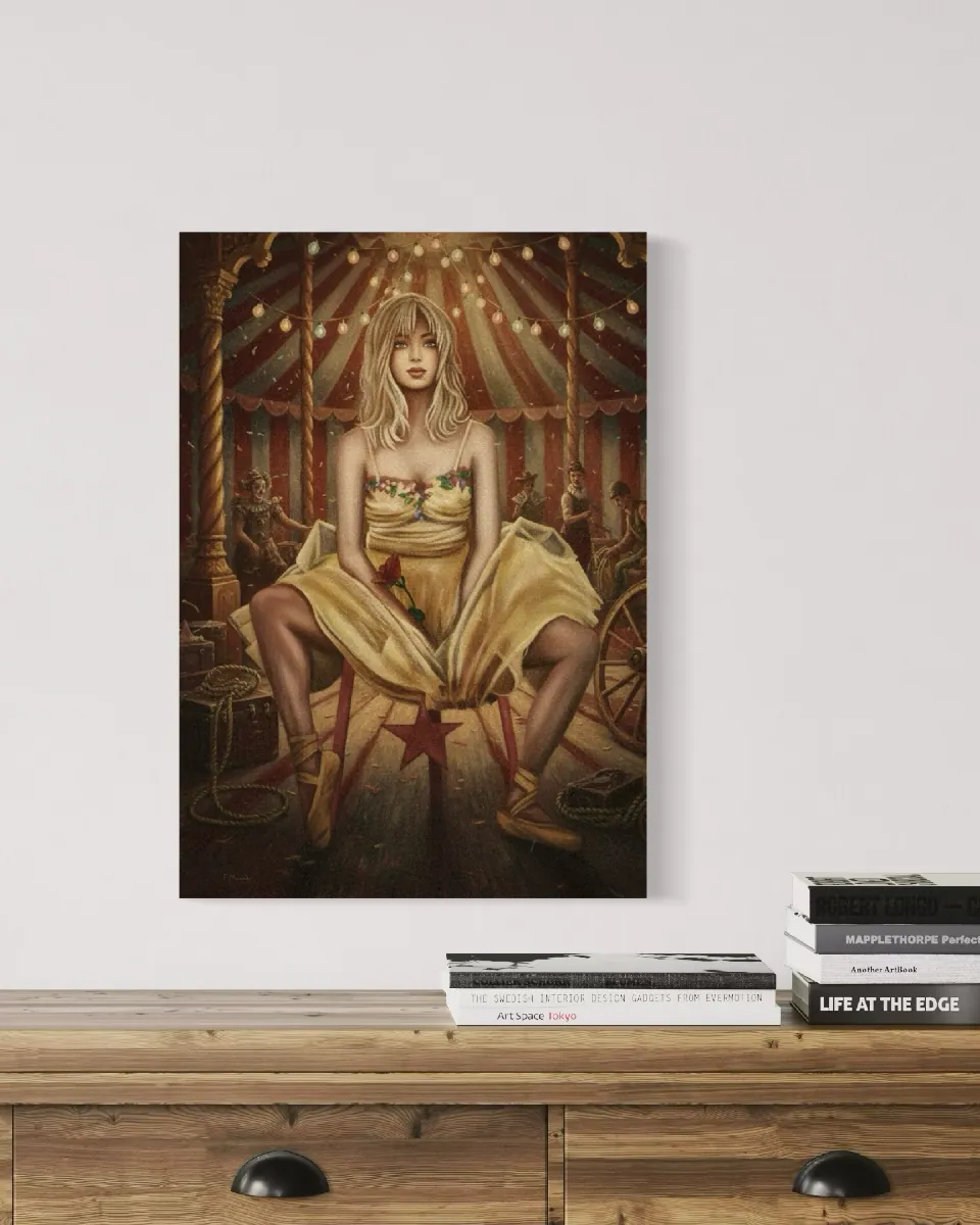 This captivating piece presents a compelling study in contrast. The central figure - a ballerina - embodies the "glamour" of performance, while the worn setting and subtle melancholy in her expression reveals the "grind'': the hard work and transient beauty of life beneath the big top. Poignant and visually rich, the painting becomes  meditation on resilience and the quiet elegance achieved  amid demanding circumstances.