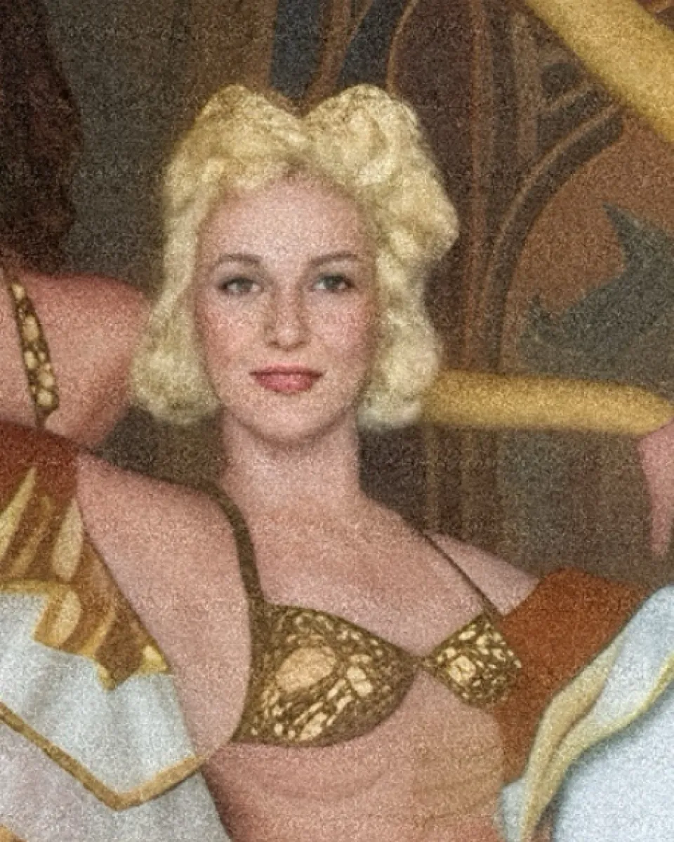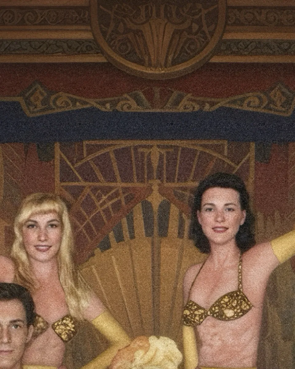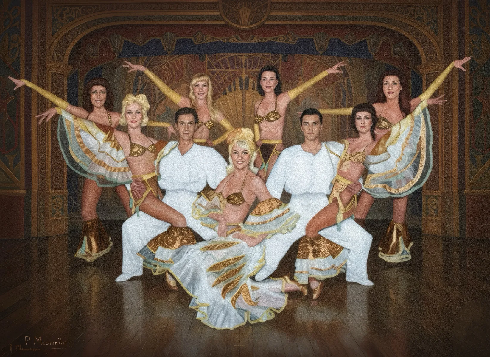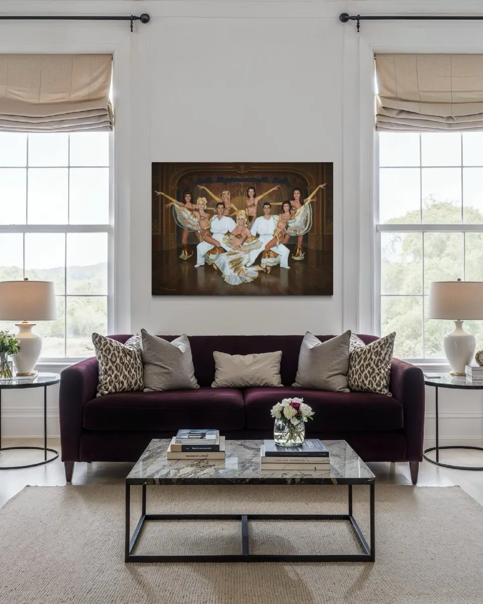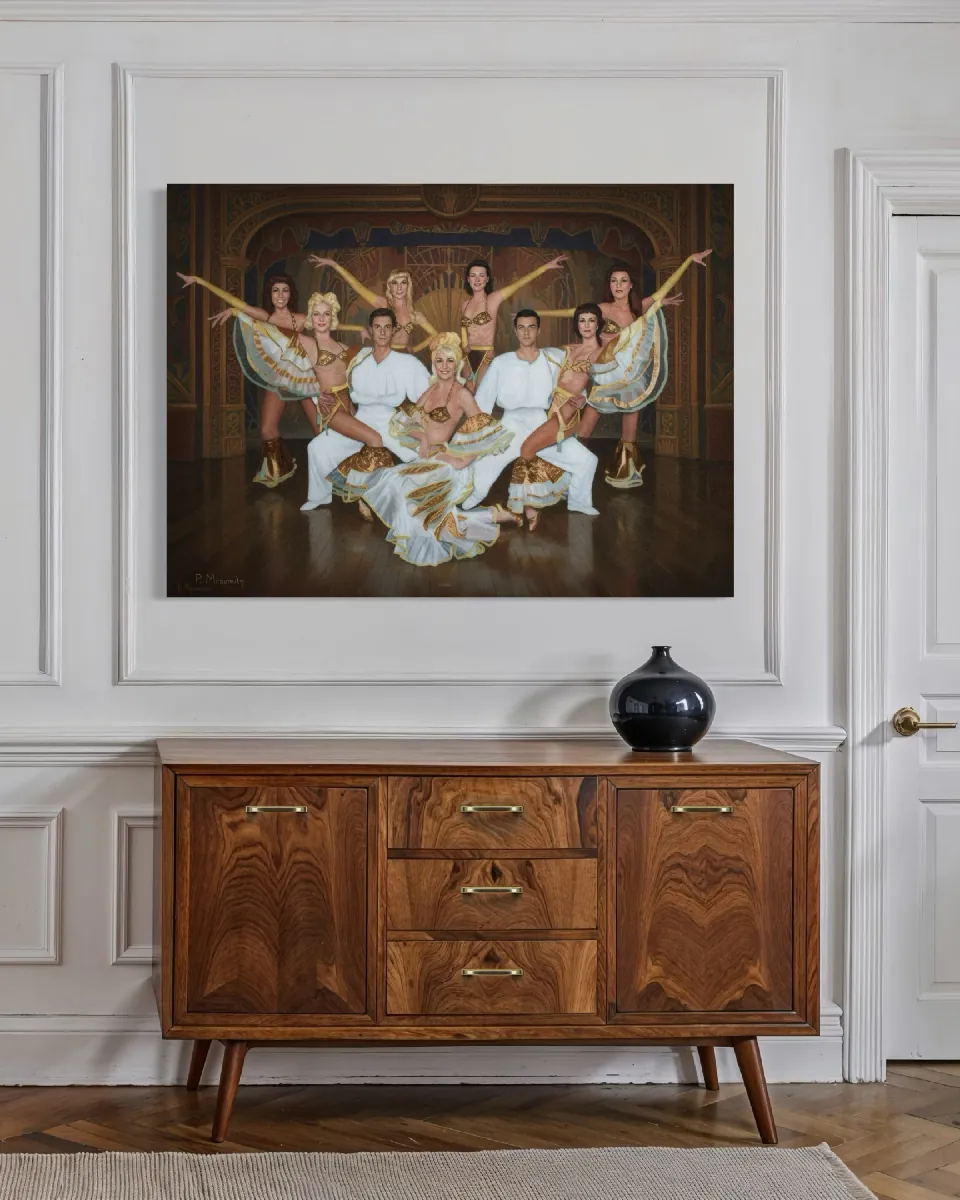 A vibrant painting that transports the viewer directly to the opulent stage of a mid-20th-century revue.