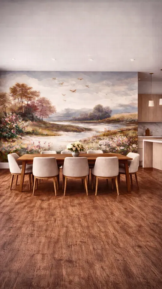 Hand-painted murals are designed site-specifically, responding to light, scale, and atmosphere—transforming interiors into immersive, living artworks.